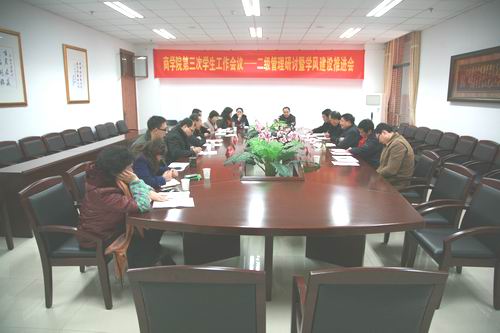 商学院第三次学生工作会议于12月2日上午在行政楼5322室举行。出席此次会议的有董新华副校长,学工部正副部长、商学院正副院长、院办主任和全体辅导员。会议由朱元午院长主持。