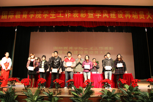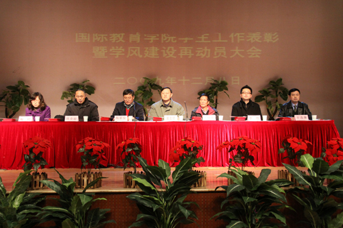 2009年12月8日下午,国际教育学院在三江会堂召开了学生工作表彰暨学风建设再动员大会。出席大会的领导和嘉宾有:我院黄克明院长,校学风建设联络员、校学工部朱银亮部长,我院陶长安院长助理,学工办李佳主任、于浩康副主任,英语教研室陈克能副主任,分团委书记陶红老师,以及部分专业课教师和我院全体辅导员、英语老师、行政人员、07至09级全体学生,共计800余人。大会由我院院长助理陶长安教授主持。