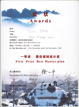 2009年11月底至12月初,建筑系刘涛等6名学生在周霖、吴义柏两位老师的带领下,参加了在连云港市举办的第八届连云港2009国际城市建筑设计竞赛(WAW),取得了优异的成绩,其中,刘涛同学获得了最佳规划设计一等奖。