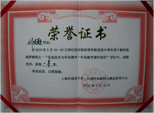 每年举行一次的“全国高等学校英语中青年骨干教师高级研修班” 由上海外国语大学,中国外语教材与教法研究中心组织承办,旨在进一步深化我省高校外语多媒体教学改革、提高高校英语师资的教学方法和教学水平。在本次研修班中,有来自全国各地的高校英语教师参加培训及竞赛。参赛人数多、专业性强、竞争激烈。上海外国语大学,中国外语教材与教法研究中心邀请了董剑桥、李萌涛教授对参赛教师的多媒体教学课件进行了认真的评选,最后评出了一等奖1名,二等奖2名,三等奖3名,优胜奖若干。