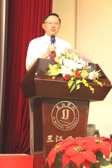 大会在庄严的国歌声中拉开序幕。国际教育学院院长黄克明教授首先致辞。黄院长在致辞中深情回顾了国教院从无到有、从小到大的艰辛的创业历程,并从人才培养质量、教育教学工作等方面总结了国教院五年来所取得的成绩。他指出,国教院成立五年来,在校生从第一届67名同学发展到现在超过700名同学,累计招收学生已超过千人;三届累计毕业人数超过500人,连续两年毕业生就业率达95%以上,刚刚毕业的10届毕业生就业率截止目前已达92.55%,位列全校首位;从就业率这一关键指标来看,国教院的人才培养质量得到了社会的认可,经受住了市场的检验。同时,国教院五年来按照中外合作办学规律严谨办学、不断探索与发展,狠抓教育教学不放松,使得办学层次得以提升、合作项目稳中有进、英语教学更具针对性、专转本工作持续推进、学生工作明显好转。黄院长动情地说,这五年中承载了太多的期待,经历了太多的努力,流淌了太多人的汗水,留下了太多人的足迹,国教院所取得的成绩,离不开校领导的关心,离不开各职能部门和各院系负责人和老师们的协同努力,离不开国教院全体教职员工的奋力拼搏!