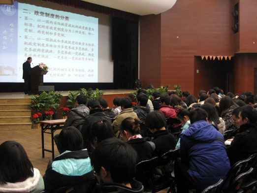 李云涛老师以“具有强大生命力的政党制度”为题,首先谈了政党制度的概念和分类。随后详细介绍了中国政党制度的具体内容、我国坚持中国特色政党制度的必要性和优越性。让同学们对中国政党制度的建立过程有了初步的了解,同时更加深刻的体会到中国共产党为中国人民做出的巨大贡献。最后,李老师总结:同舟共济创伟业,薪火相传向未来。只要我们坚持走中国特色社会主义政治发展道路,坚持中国共产党的领导,不断推进多党合作和政治协商的制度化、规范化、程序化,不断促进执政党建设和参政党建设,中国特色的政党制度就一定会不断得到巩固和发展。