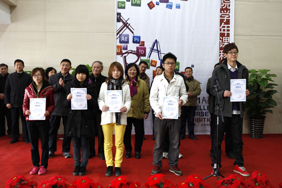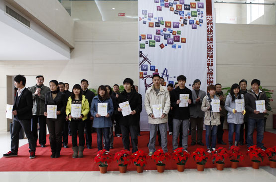 在校领导讲话以后,艺术学院副院长赵欣介绍了评奖情况,并宣布了获奖师生名单。本次艺术学院2010—2011学年课程优秀作业展,共有40个班级、一千多件作业参与评选,经评审委员会评选,共有282件优秀作业入围并展出。这些优秀的作业分别被评为学院奖一等奖、二等奖、三等奖和优秀奖,其中部分作品留校收藏。