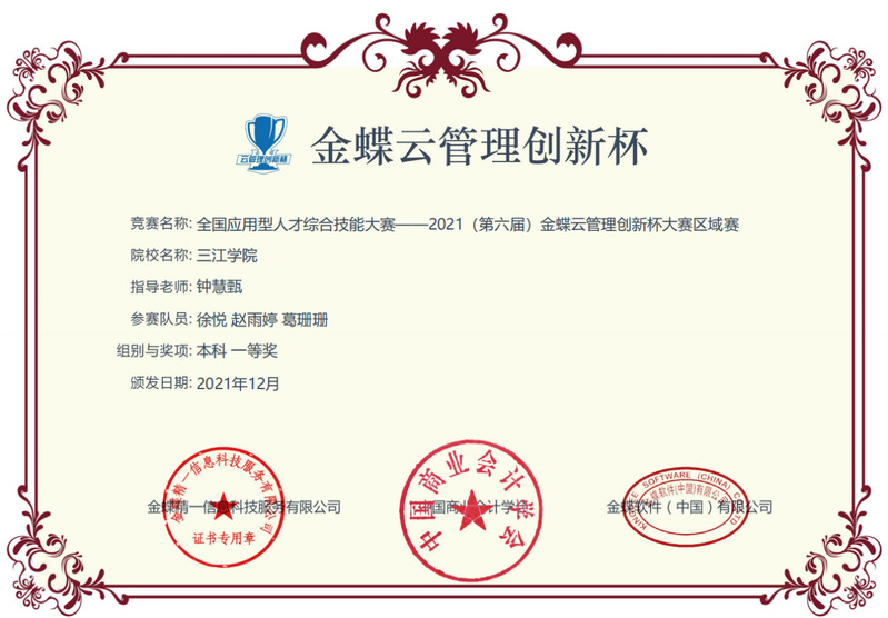 近日,由中国商业会计学会主办的2021(第六届)金蝶云管理创新杯大赛江苏赛区的区域赛圆满落幕。经过三位老师和九名学生的不懈努力,beat365vip官网登录入口的三支代表队伍在众多竞赛队伍中脱颖而出。由钟慧甄老师指导的两组19级物流管理专业学生旋风队(徐悦、赵雨婷、葛珊珊)、小羊星队(张可欣、刘晓雯、李杨)分别获得江苏省一等奖和三等奖,由孙燕老师和袁伟东老师指导的会计专业学生拼搏队(关光名、汪旭辉、熊家龙)荣获江苏省二等奖。钟慧甄老师、孙燕老师以及袁伟东老师均获得“优秀指导教师”奖。值得一提的是,尽管物流管理专业的学生是第一次参加金蝶云大赛,但在此次竞赛中旋风队获得江苏省赛区第一名的好成绩,也获得了2022年上半年参与全国金蝶云管理创新杯大赛总决赛资格。