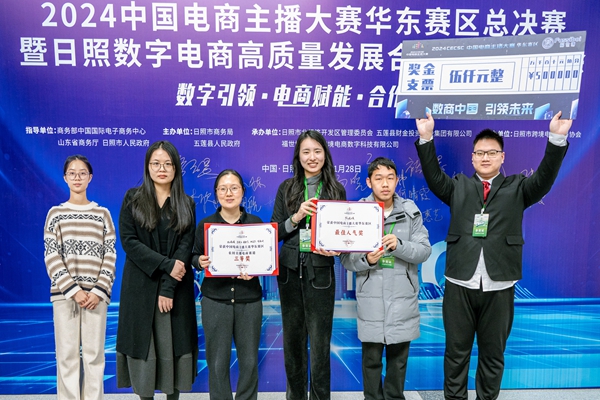 11月27至28日,2024中国电商主播大赛华东赛区总决赛在山东省日照市成功举办。由外国语学院精心选拔并指导的跨学科团队“畅意农播云起”获得农村直播电商赛道三等奖(前十强)和最佳人气奖(共三名)。团队核心成员包括主播陈媛媛(外国语学院英语专业跨境电子商务方向)、助播肖祥飞(法商学院物流管理专业)、技术林奕杰(外国语学院英语专业英语语言文学方向)和场控黄歆艺(外国语学院英语专业跨境电子商务方向)。指导老师何晴霞和武雅利获优秀导师奖,外国语学院同时荣获优秀组织奖。