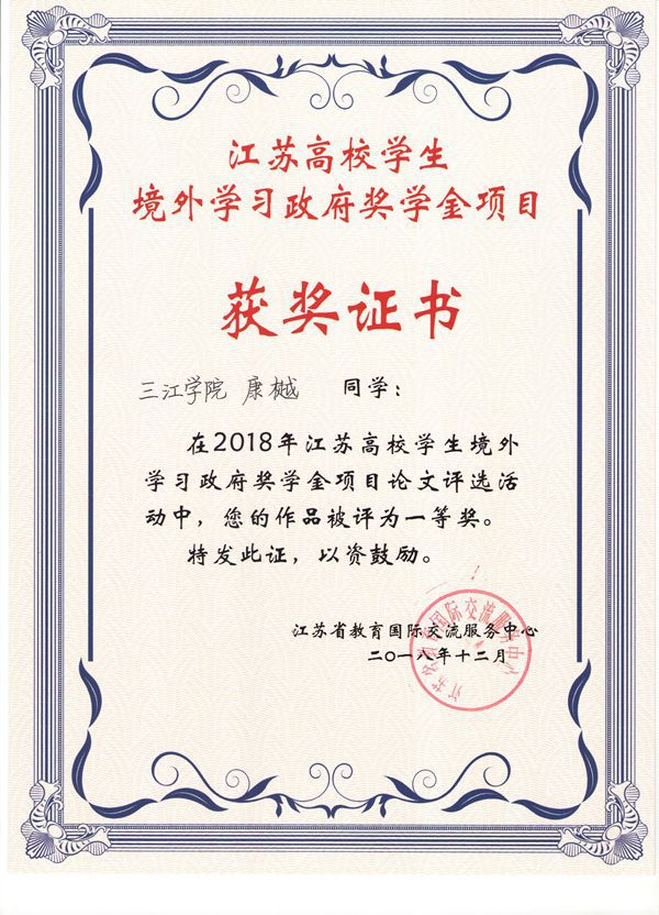 beat365学生康樾在2018年江苏高校学生境外学习 政府奖学金项目论文评选活动中荣获一等奖