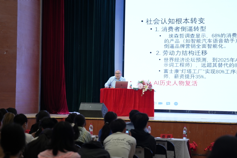 随后谈及未来趋势,虞群主任以“大模型工业化”为关键词,指出GPT-4等万亿参数模型的多模态突破标志着AI技术从实验室走向产业化的必然性。他提到,硬件算力的平民化显著降低了创新门槛,预计2025年AI将创造9700万个新岗位,并提到“提示词工程师”等新兴职业的兴起。对于学生担心的“AI取代人力”问题,他巧妙结合开场环节,提出“人机协同才是未来”的观点,赢得阵阵掌声。