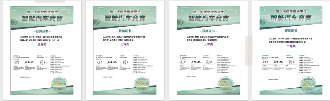 赛场之上,机电学子沉着应战,凭借稳定可靠的车模系统、成熟的控制算法和良好的团队配合,在各组别比拼中稳步推进。缩微电磁组精准完成环岛赛段,缩微光电组从容应对断路干扰,极速光电组全力冲刺最优成绩,双车跟随组展现了良好的协同控制效果。经过激烈角逐,参赛队伍最终在四个组别中全部获奖,取得华东赛区三项三等奖和一项二等奖的优异成绩。