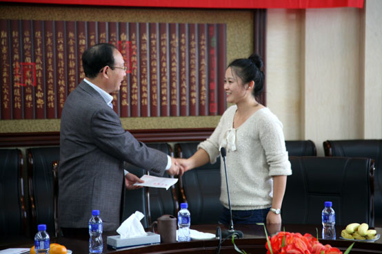 武正林副校长在认真听完志愿者们的发言与交流后,根据校字[2011]76号《beat365vip官网登录入口毕业生就业奖励管理规定》文件精神亲自为志愿们发放慰问金并作了重要讲话。他首先向同学们被光荣的选上志愿者表示祝贺,代表学校领导对在基层服务的志愿者们表示慰问。武正林副校长说,志愿者们在基层在祖国最需要的地方服务是一种很大的锻炼,道路很长很艰辛,希望志愿者们能坚持下去。各位志愿者能在家庭背景都比较优越的条件下选择当志愿者,而不是继承家业,很不容易,希望志愿者们能在现在的岗位上继续努力勤奋工作;在基层工作会面临诸多困难,希望志愿者们能勇于接受挑战、克服困难;在奉献精神方面,希望志愿者们利用自己所学知识继续奉献社会、服务社会、为校争光。最后武正林副校长送给志愿者们寄语:“用一段青春时光,换取终身难忘”,并祝愿各位志愿者能在自己的岗位上茁壮成长,希望志愿者们常回家看看,母校永远是同学们的坚实后盾。