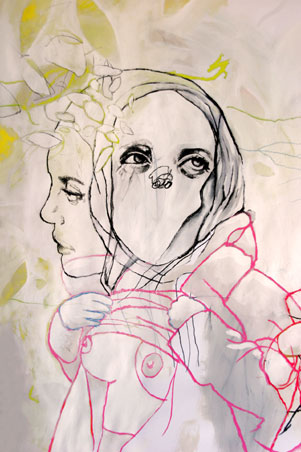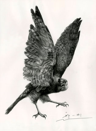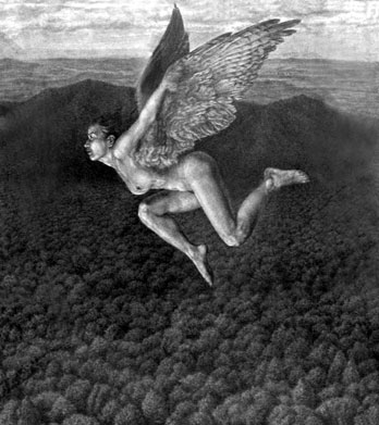 邢小刚就是一位精于用单纯的工具、单一的颜色,用点、线、面,黑、白、灰的绘画语言来塑造形象,表达内心世界的创作素描画家。他说“素描是具有独立绘画语言和审美价值的画种,最能体现艺术家本人的个性与风格,是艺术家面对客观世界最朴实、直接的感情流露”。邢小刚的素描创作作品具有强烈的个人风格,他精于对形体结构分析和比例解剖的掌握,善于利用明暗光影,有着扎实的素描造型能力。他的作品中蕴藏着一股超然的力量。他说“我就是要在一个真实的空间里,创造出一个梦幻、理想的世界”、“我是一个忠实表现我梦中遭遇的人”。在他的创作素描作品《飞》中,我们看到了一个美丽的青年裸女,张开丰满的翅膀,飞翔在郊外的山丘上空。画面是以一个与飞翔者同行的视点构图的,俯瞰是连绵的山丘,茂密的树林,远处视平线上隐约的村庄和城市。仰视是蓝蓝的天空,飘着白云。很容易让人想起乘飞机起飞或下降时的场景,难道他是在这一刻得到的灵感吗?裸女是否象征着单纯?翅膀是否象征着理想、自由?真实的场景是否意味着要在现实生活中实现理想的一种渴望?……我没有问过他,我知道面对一幅作品,不同的人会有不同的感触。邢小刚是一个有思想的画家,在他的作品中常常能体会到对人生的感悟。他经常对他的学生说“在创作时,应该是紧锁眉头的”。所谓的“紧锁眉头”就是在思考,就是在感悟……在他创作的《悟》中,我们看到一个健壮的裸体男性,头部略低,微合双眼,略锁眉头,有力的双手紧抱双腿膝部,整个人物悬在空中。手部突出的肌腱、臂膀暴显的血管与平静的头部形成对比,暗示着“宁静致远”的境界。本次画展展出了画家60多幅素描创作作品。