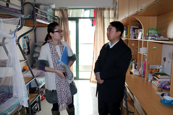 浙江传媒学院后勤管理处物业管理负责人向周更生副校长介绍学生宿舍情况