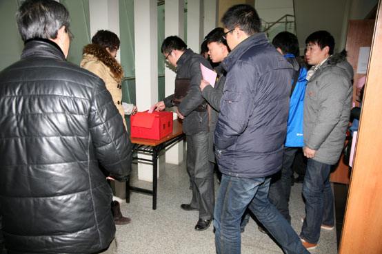 接着三届二次教代会暨工代会正式代表,在对校领导工作满意度测评中,以主人翁的精神,投下了庄严地一票。
