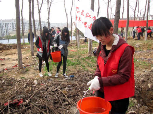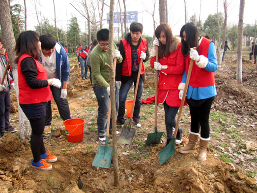 在2013年3月12日第35个植树节来临之际,beat365vip官网登录入口团委与春江新城社区联合举办开展了以“迎青奥,倡绿色,共创文明家园”为主题的植树造林、绿化生活、美化环境的义务植树活动。参加活动的人员有beat365vip官网登录入口各个院系的志愿者,以及春江新城社区的职工志愿者。在活动中,志愿者们三五个一组,拿着铁锹,提着水桶,满怀希望地种下了一棵棵广玉兰、香樟和杨树,期盼着它们快快长大长高,成为绿化环境、美化生活的绮丽风景。