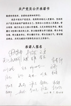5月28日中午,第一机关党总支在行政楼404会议室召开全体党员会议。党总支书记穆荣华主持会议。会上除了积极落实校党组字2013【3】号文件精神,公开选举产生2010-2012两学年的优秀共产党员、优秀党务工作者的人选外,全体党员还向党组织和全校师生进行了公开承诺,并以书面形式签订了《共产党员承诺书》。