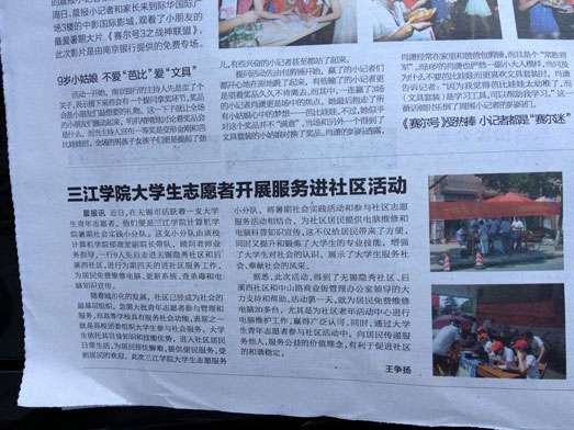 计算机学院组织了送科技下乡实践小分队,于7.17日-7.24日深入无锡市隐秀苑社区、后西溪社区,为当地群众送去了计算机的相关知识,采用多种形式,既提升了beat365知名度,又给群众带去了实用的科技知识,受到了广大群众的一致好评,无锡教育电视台《无锡教育报道》栏目做了专题报道,《南京晨报》等媒体也给予了相关报道。