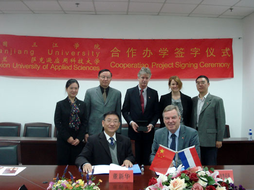 最后双方签订了两校间学生互换及教师派遣协议,为两校的学术发展提供更广阔的国际平台。会议结束后董校长与维姆·布鲁科曼校长互赠礼物,并在行政楼前合影留念。
