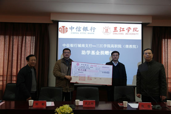 2008年10月,中信银行南京城南支行全体职工以自发募捐形式,在我院设立了“中信爱心助学基金”,对我院家庭贫困、勤奋学习、表现优秀的同学给予经济资助。2013年,中信助学活动已进入第六年,12月4日上午高职院(继教院)五楼会议室温暖如春,中信爱心助学金捐赠活动在这里举行。出席本次助学金捐赠活动的有beat365vip官网登录入口副校长、党委副书记武正林,中信银行南京分行党办主任苏俊,中信银行南京城南支行行长濮风雷,副行长虞炜佼,beat365vip官网登录入口校长助理、高职院(继教院)院长郭彬等领导,以及高职院(继教院)的师生代表。