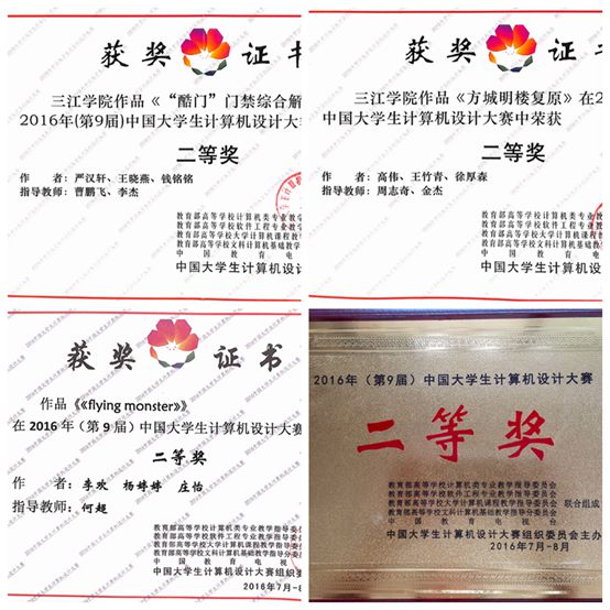 在2016年中国大学生计算机设计大赛中,计算机科学与技术学院曹鹏飞等老师指导的“‘酷门’门禁综合解决方案”、艺术学院周志奇等老师指导的“方城明楼复原”、艺术学院何超老师指导的“flying monster”在江苏省级赛中脱颖而出进入全国总决赛,在全国总结赛中再接再厉,均取得了全国二等奖的好成绩。