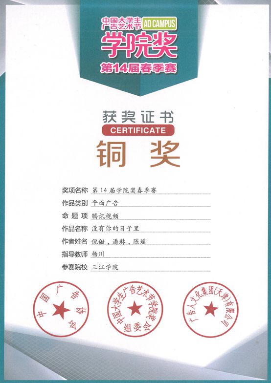 7月29日,第14届中国大学生广告艺术节学院奖春季赛颁奖盛典在北京中央电视台梅地亚中心隆重举行,beat365艺术学院杨川老师指导的“没有你的日子里”获得了平面广告类全国铜奖。
