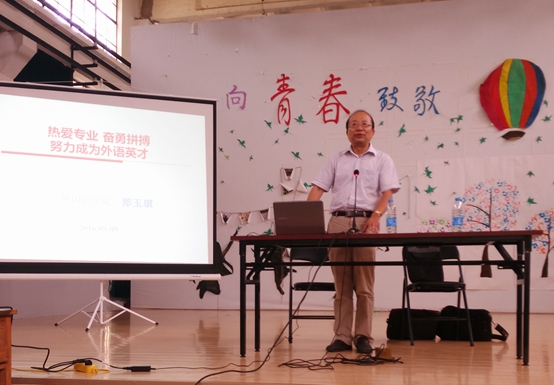 在新生专业介绍会上,首先郑玉琪院长给大家做了题为“热爱专业、奋勇拼搏,努力成为外语英才”的报告。报告中介绍了外国语学院的概况,包括学院的构成、师资力量、学科专业等。郑院长给同学们提出了几点希望和建议,希望大家热爱外语专业,端正专业思想,明确培养目标,制订适合自己的学习计划等等。随后英语系和日语系的同学分开,由各自的专业负责人带领了解专业情况。外国语学院副院长揭侠教授向日语系的同学们介绍了日语专业的概况、师资队伍、专业培养方向、以及就业情况。近几年日语系在学生社会实践方面发展很不错,对外交流广泛,与日本大阪府立大学、日本大东文化大学、九州外国语学院以及长野大学签有合作协议,迄今为止已选送近60名学生进入上述大学开展交流或继续深造。揭侠教授希望同学们打好扎实的语言基础,多参加社会实践活动积极经验,提高自己的就业能力。英语系何晴霞主任的介绍分为五个部分。首先是英语系的概况,包括英语系的历史、师资构成、专业培养方向、就业情况等等。第二是解读《高等学校英语专业本科教学质量国家标准》,带着同学们了解英语专业的培养目标、要求、课程体系等。第三是介绍英语专业16级本科培养计划,介绍不同的课程类别和它们各自所占学分的比例,必修课、选修课的特点等等。第四是介绍英语专业学生需要考取的专业证书及可以选考的职业技能资格证书,除了本专业所必需要参加的专业考试,选考一些职业技能资格证书可以增加同学们毕业时的就业竞争力。最后何主任介绍了英语专业学生历年的各项实践活动情况,包括参加国家级、省级、校级竞赛,实践周学生的各项汇报演出,如英语配音、戏剧表演、演讲、英语报刊制作等等。同时还介绍了英语系和省体育局合作推荐学生为各项国际赛事的志愿者的情况。她希望同学们规划好自己的学习、娱乐、社会活动,有一个明确的目标,多沟通多交流。