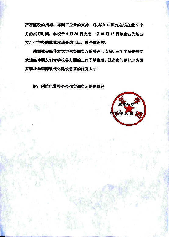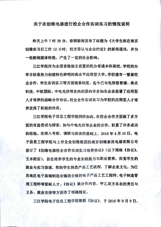 关于在创维电器进行校企合作实训实习的情况说明