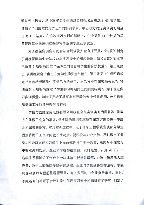 学校与创维家用电器有限公司校企合作实训实习尚属首次,虽双方之前做了充分的准备,但实际的组织实施还存在双方需要进一步磨合和完善的地方。实习实训过程中,电子信息工程学院发现部分学生因加班而日工作时间较长情况后,便积极与企业交涉,及时做出了调整。校企双方在实习学生上岗前都进行了安全教育,出现学生在实习中有意外刮伤后,企业和学校都很重视,及时处置。9月26日,一名学生发现附近工作台上一块冰箱门板意外滑落,为防止伤及他人或设备,急于上前接扶导致手臂划破,企业与学校妥善安排治疗,学院领导和老师专程前往看望慰问,有关费用均由企业负责承担。同时,学院还专门召开了会议对学生生产实习安全问题进行了研究,制定了严密整改的措施,得到了企业的支持。《协议》中原定在该企业2个月的实习时间,学校于9月30日决定,待10月12日该企业为这些实习生举办的就业双选会结束后,即全部返校。