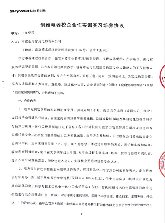 beat365vip官网登录入口电子信息工程学院同样如此,在校企合作方面做了多方面的有益尝试与探索,如与中电光伏等企业的合作,积累了许多成功的经验。在深入考察、调研与洽谈的基础上,2016年4月15日,电子信息工程学院与上市企业创维集团的南京创维家用电器有限公司签订了《创维电器校企合作实训实习培养协议》(以下简称《协议》,文本附后),旨在培养学生的专业实践能力与职业素养,拓宽学生的就业与实习渠道,帮助学生熟悉产品工艺流程,了解企业文化,为江苏地区电子高端制造业输送合格的电子产品工艺工程师、电子制造管理工程师等紧缺人才。《协议》就合作内容、甲乙双方各自的责任与义务、就业安排等方面作了明确规定。