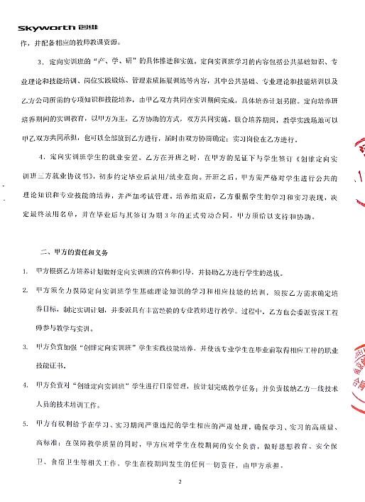 创维电器校企合作实训实习培养协议