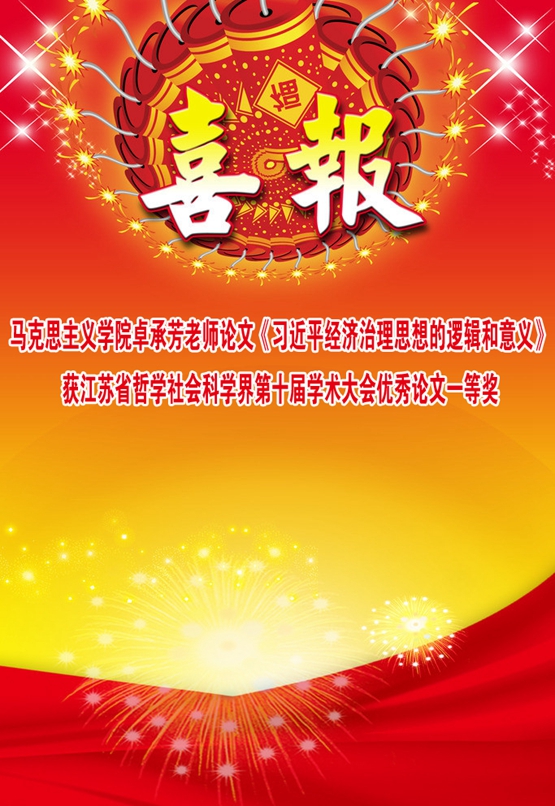 江苏省哲学社会科学界第十届学术大会11月26日至27日在常州大学举行,马克思主义学院卓承芳老师应邀参会并向大会提交了题为《习近平经济治理思想的逻辑和意义》的论文,经大会评选,该文获得优秀论文一等奖。这是卓老师继获得2016年省社科基金后期资助项目立项以后又一项重要学术成果。