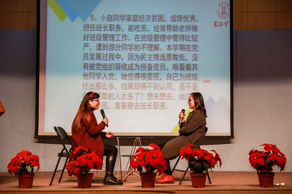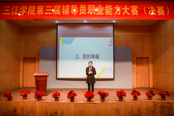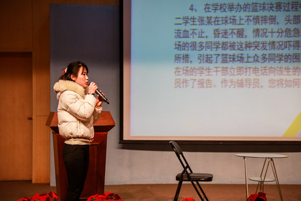 决赛分主题演讲、谈心谈话和案例分析三个环节,内容涉及大学生就业创业指导、突发事件处理、心理健康教育疏导、日常教育管理等各个方面。主题演讲环节分命题演讲和即兴演讲,各位选手均能在较短的时间理清思路,结合自己的切身体会诠释了每个演讲主题。谈心谈话比赛中,面对学生提出的各种问题,各位选手能够随机应变,现场开展思想教育工作,生动地展现了辅导员的日常工作状态。在案例分析阶段,各选手均找到问题的关键点,逐一给出事例处理的步骤和措施,充分展示了辅导员的职业能力和素养。