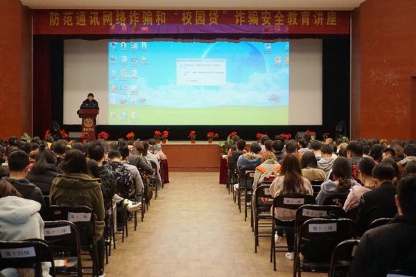 3月16日中午,校保卫处、学工部会同雨花台区公安分局联合在三江会堂举行大学生防范通讯网络诈骗和“校园贷”诈骗安全知识教育讲座。雨花台区公安分局内保大队桂著峰大队长、路海云教导员、王思敏警官,校学工部仇存进部长、学工副院长、辅导员、保卫干部以及学生代表600多人参加。讲座由雨花台区公安分局网安大队詹春警官主讲,校保卫处李云涛处长主持。
