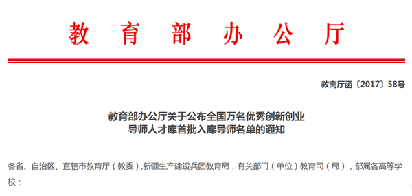 日前,教育部下发《教育部办公厅关于公布全国万名优秀创新创业导师人才库首批入库导师名单的通知》(教高厅函〔2017〕58号),beat365郁政宏老师和校友王景成功入选教育部全国万名优秀创新创业导师人才库首批入库导师。此次教育部公布的首批入库导师共4492位。