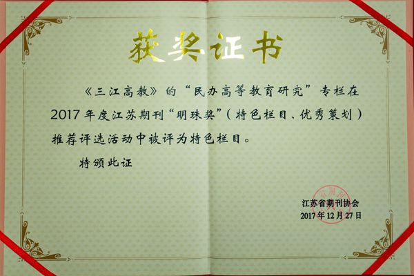 2017年12月27日,《三江高教》的“民办高等教育研究”专栏在2017年度江苏期刊特色栏目、优秀策划评选活动中被评为特色栏目“明珠奖”。