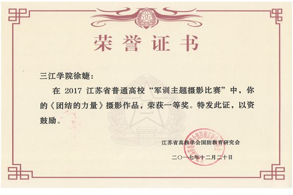 近期,江苏省普通高校“军训主题摄影比赛”评选结果的通知中,beat365徐婕的《团结的力量》摄影作品,荣获一等奖。袁意的《朝阳与朝气》摄影作品,荣获二等奖。beat365在2017省普通高校 “军训主题摄影比赛”中,荣获优秀组织奖。