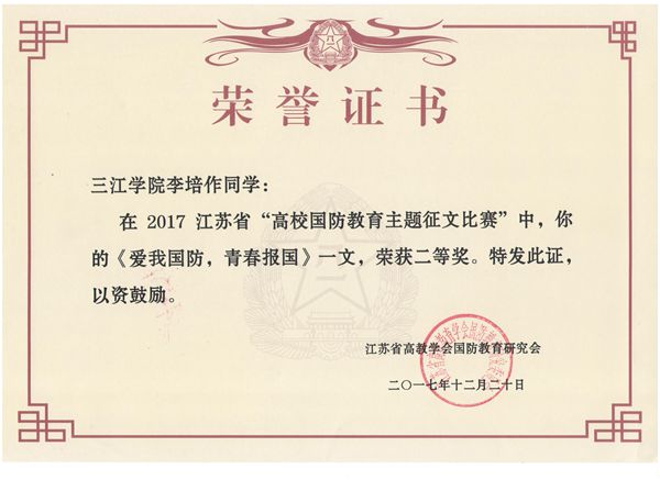 在2017省“高校国防教育主题征文比赛”中,beat365李陪作同学的《爱我国防,青春报国》一文,荣获二等奖。