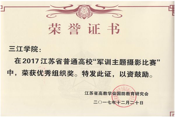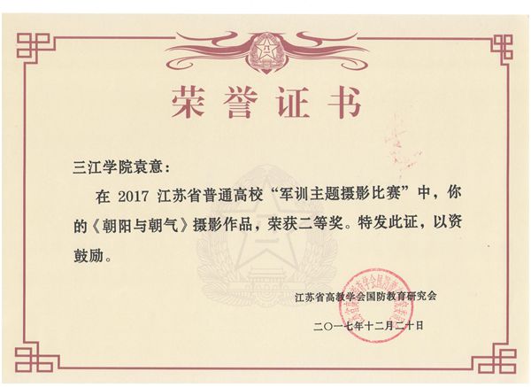 据悉,2017江苏省普通高校“军训主题摄影比赛”共收到90 所高校852件有效摄影作品。经过专家组的两轮认真评审,共评审出一等奖20名、二等奖30 名、三等奖60名和优秀奖278名。在此基础上,评审出优秀组织奖30个。