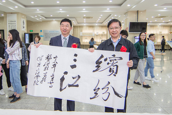 5月21日上午,由党委宣传部、校团委主办,社团联合会书画协会承办,南京龙神书画艺术研究院、中国书法家园网、南京市青年书法家协会以及校图书馆协办的纪念马克思诞辰200周年暨“艺汇三江”第十一届南京高校书画篆刻交流展在图书馆大厅隆重举行。王小锡副校长出席开幕式并致辞,著名书画家龚洪林、黄学江、黄征、孙径舟和beat365相关职能部门及学院领导、学生代表等百余名师生共同参加了此次开幕式。