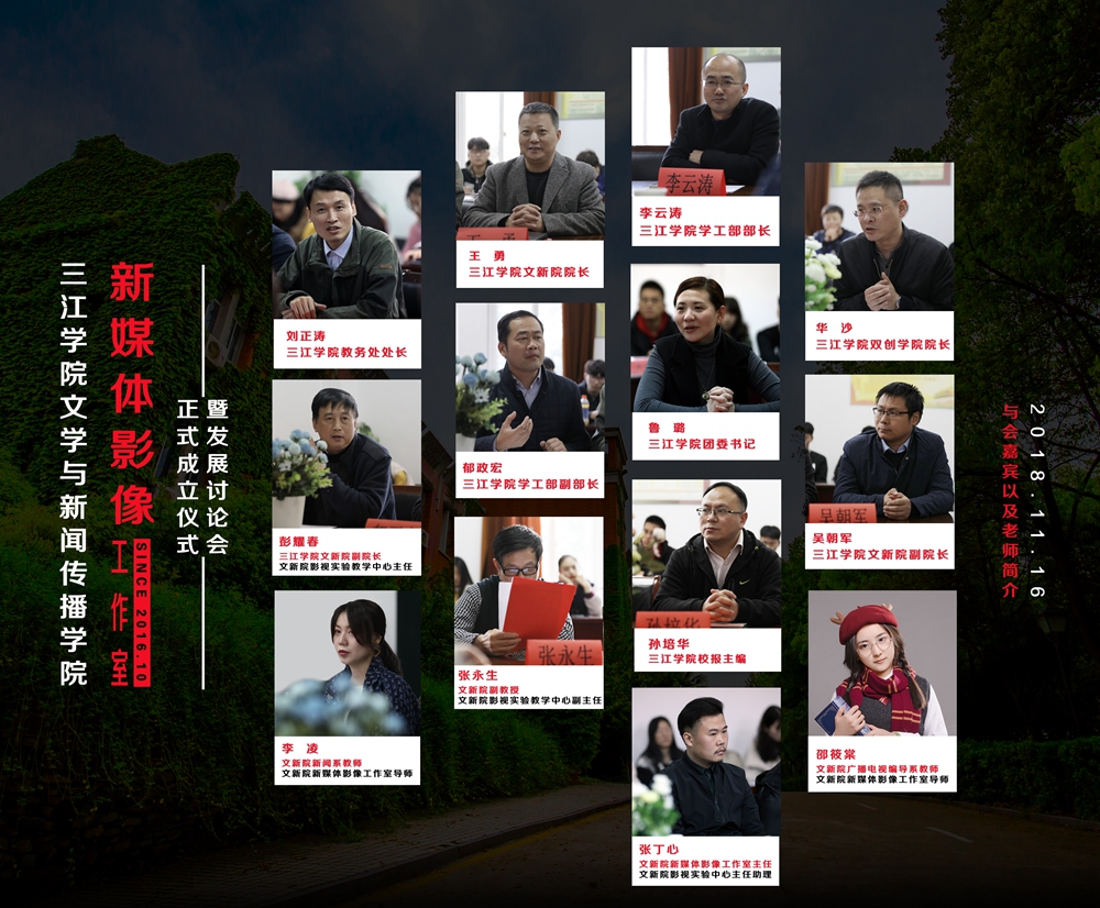 11月16日,文新院三楼317会议室隆重召开新媒体影像工作室成立大会,校学工部李云涛部长、文新院王勇院长、教务处刘正涛处长、学工部郁政宏副部长、双创学院华沙院长、文新院彭耀春、吴朝军副院长、团委鲁璐书记、党委宣传部孙培华老师及部分教师、学生参加大会,会议由文新院彭耀春副院长主持。