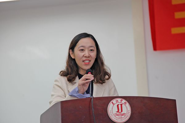 孩子王儿童用品股份有限公司南京分公司人力行政经理孙文君发言。她对我院学生实习的情况进行了总结,表示高职院培养的专业知识丰富、动手能力强的学生受到用人单位的欢迎。