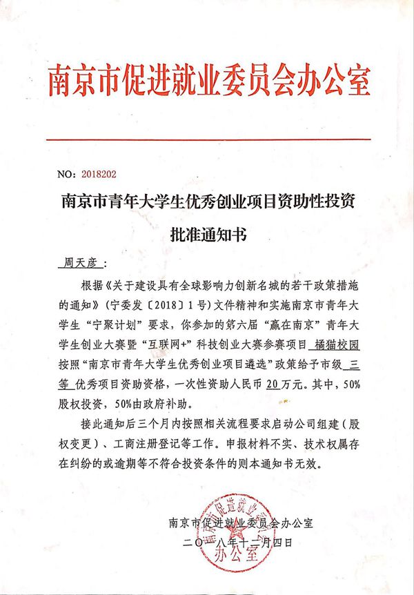 根据《关于建设具有全球影响力创新名城的若干政策措施》的通知(宁委发〔2018〕1号)精神和实施南京青年大学生“宁聚计划”要求,beat365积极组织4个孵化基地大学生创业团队参加“赢在南京”青年大学生创业大赛,最终经过大赛,及专家组评估与审核,beat365周天彦同学的“橘猫校园”获得市级优秀项目资助资格。