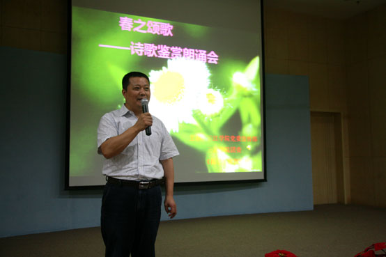 诗歌朗诵会开始,党委宣传部部长王勇博士对本次活动作了简单介绍,他说,这次的诗歌鉴赏会首次进行了学校师生和著名诗人的互动,这使我们可以更深入地了解与品味原创诗歌。著名诗人、《扬子江诗刊》主编子川老师讲话,他鼓励大学生要多阅读文学作品,并希望参见诗会的同学能有所收获。