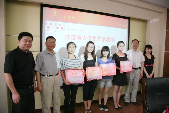 表彰大会开始,屈伯俊书记简单介绍beat365参加江苏省第三届艺术展演的备战及获奖情况。接着,董校长、武正林副校长分别给获奖作品的演职人员颁发了获奖证书。